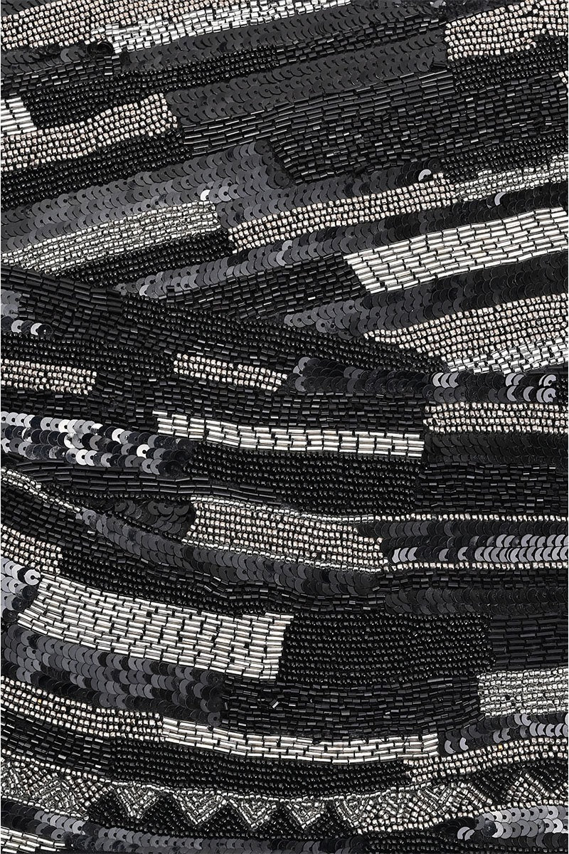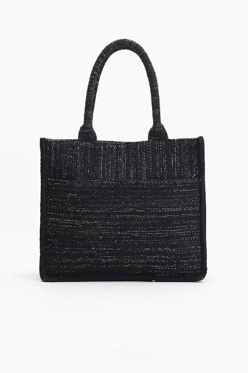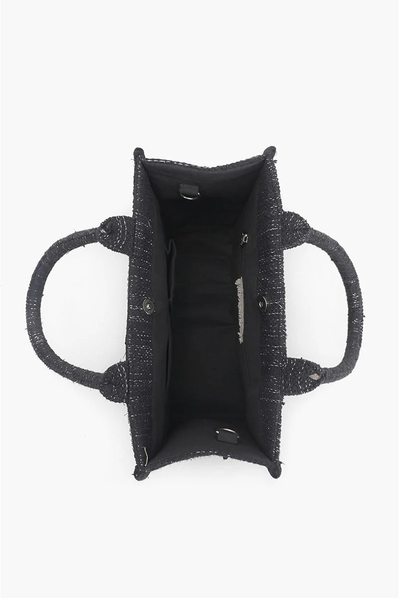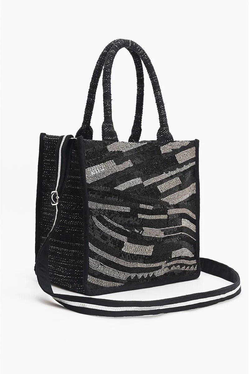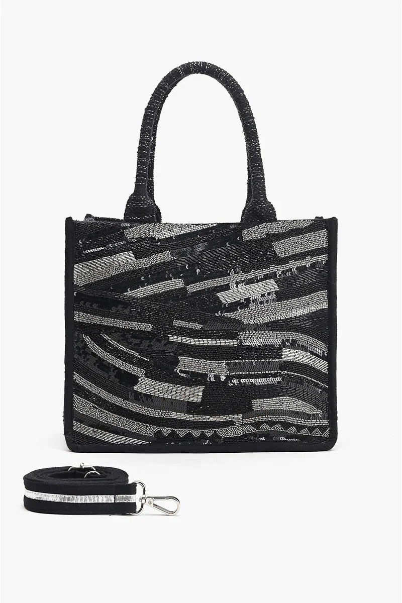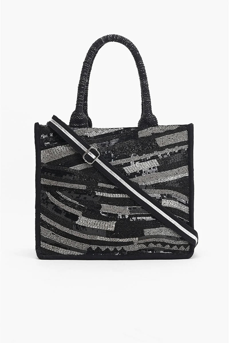 Hand-beaded to perfection with a stunning black sand pattern in Jacquard and Lurex detailing, this tote is as elegant as it is eye-catching. With a fully lined interior and a handy zip pocket, you'll keep your essentials stylishly secure. The rolled-up handheld straps and detachable crossbody straps offer versatility—carry it your way, whether you're strolling the city streets or heading to a chic soirée
