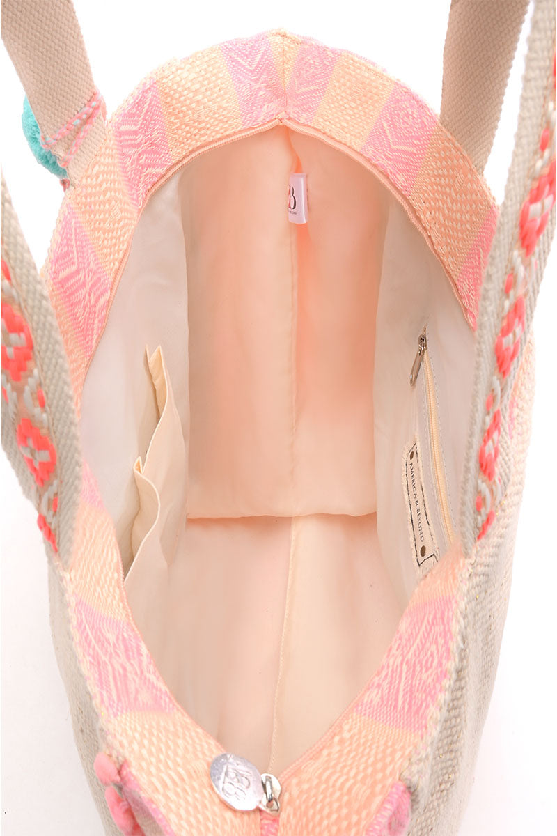 We love how 'eye-catching' our bling eye boho bag is! Crafted with pink-peach jacquard fabric, its hand-embellished eye pattern is adorned with beads and sequins. Comes with top zip closure, inner lining, and zipper pocket. Don't miss the adorable mini pompom details!