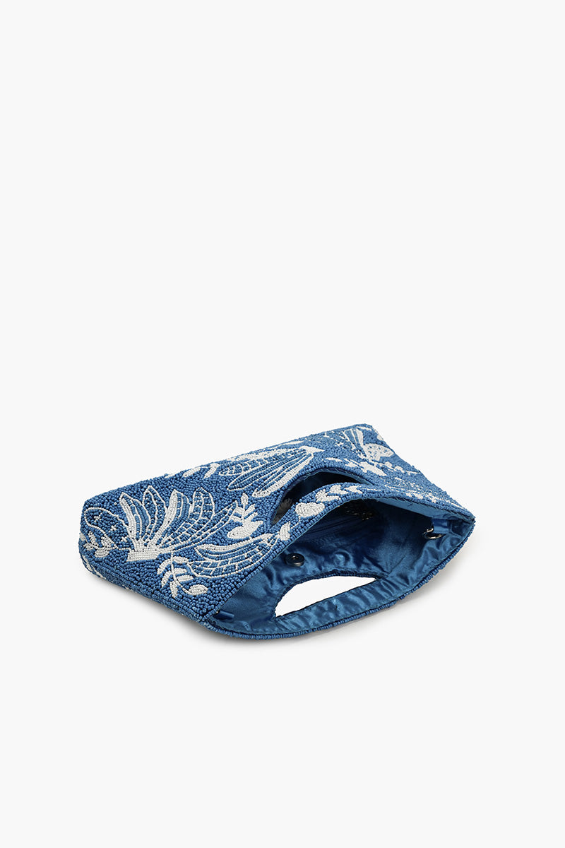This stylish clutch makes a bold statement, set on a vibrant blue base with an intricate beaded white banana pattern—striking the perfect balance between quirky and chic.