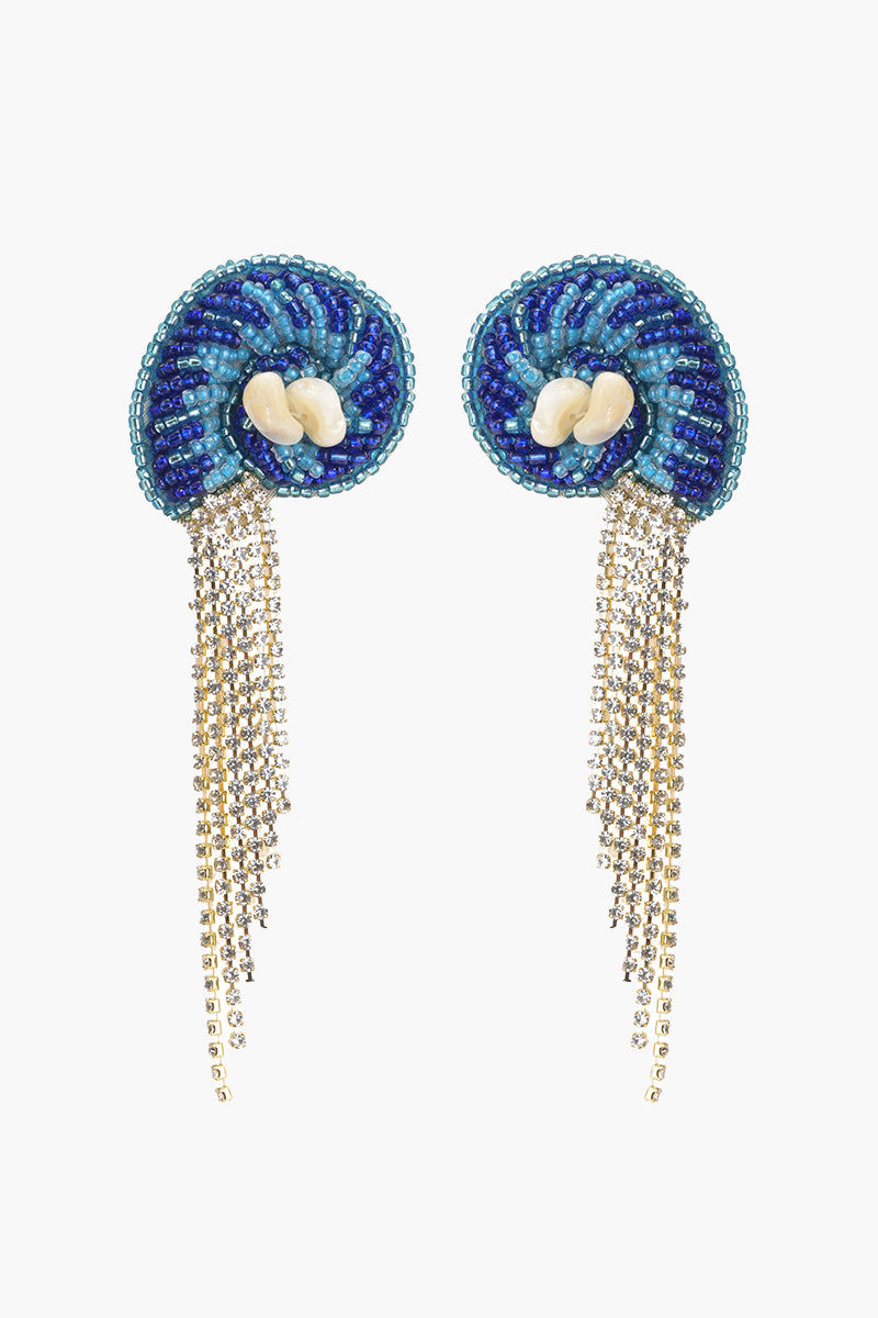 These handmade beaded earrings feature a graceful half-round shell shape, accented with delicate stone chain fringes that sway with every movement. Crafted in an elegant blend of gold, silver, and off-white tones, they strike the perfect balance of coastal charm and understated luxury. The back-center pin ensures a secure, comfortable fit, letting you shimmer effortlessly from beach days to brunches—or even boardroom slays.