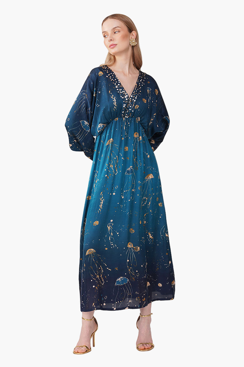 The Deep Sea Dream Ombre Maxi Dress is crafted for moments that call for drama wrapped in elegance. Its deep front V-neckline is highlighted with delicate sequin embroidery that catches the light with every move. The extended full sleeves end in cuffs finished with fabric buttons, adding sophistication to the flowy silhouette.