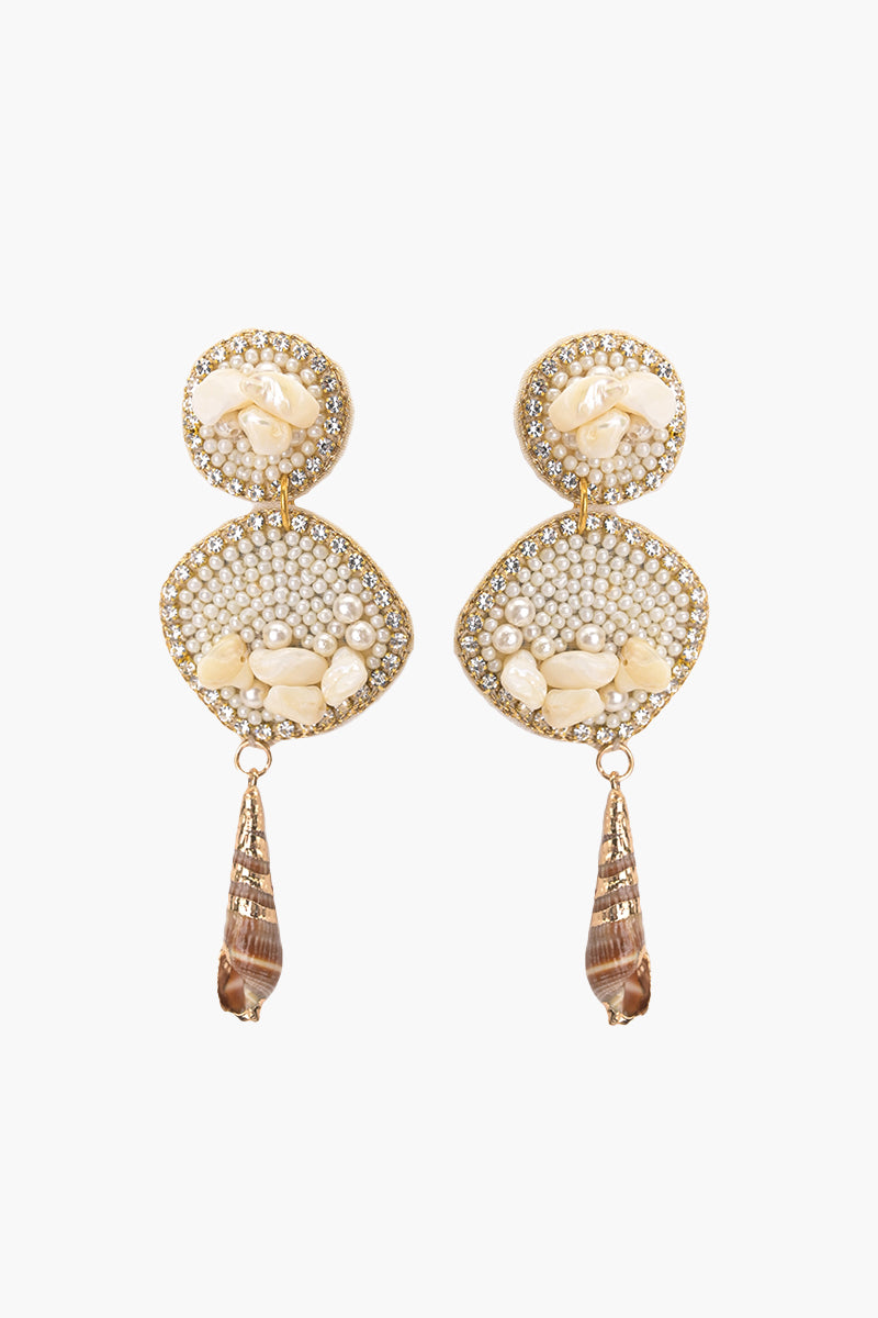 These handmade beaded shell earrings are your new seaside sweethearts, featuring delicate shell drops that sway like a gentle ocean breeze. The round stud tops are crafted from natural agate stones and secured with a jump ring and back pin, keeping them comfortably in place. Handcrafted in earthy, natural tones, each pair brings a touch of wearable sunshine to your look.