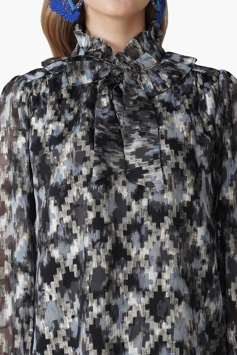 Up top, the neckline is styled with double frills and an extended tie knot that can be worn loose or in a bow. Chic yet easy to wear, this dress is made for moments when you want to look effortlessly pretty without overthinking it.