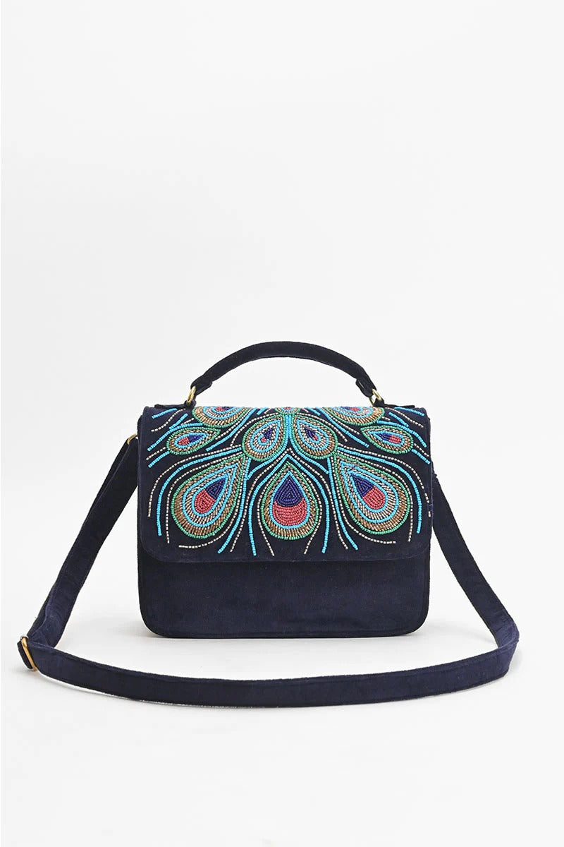 Functionality meets fashion with this gorgeous hand embellished Peacock Handbag. It offers ample space to accommodate your daily essentials, making it a practical choice for work, errands, or leisurely outings. This comes with a Detachable Crossbody Strap.