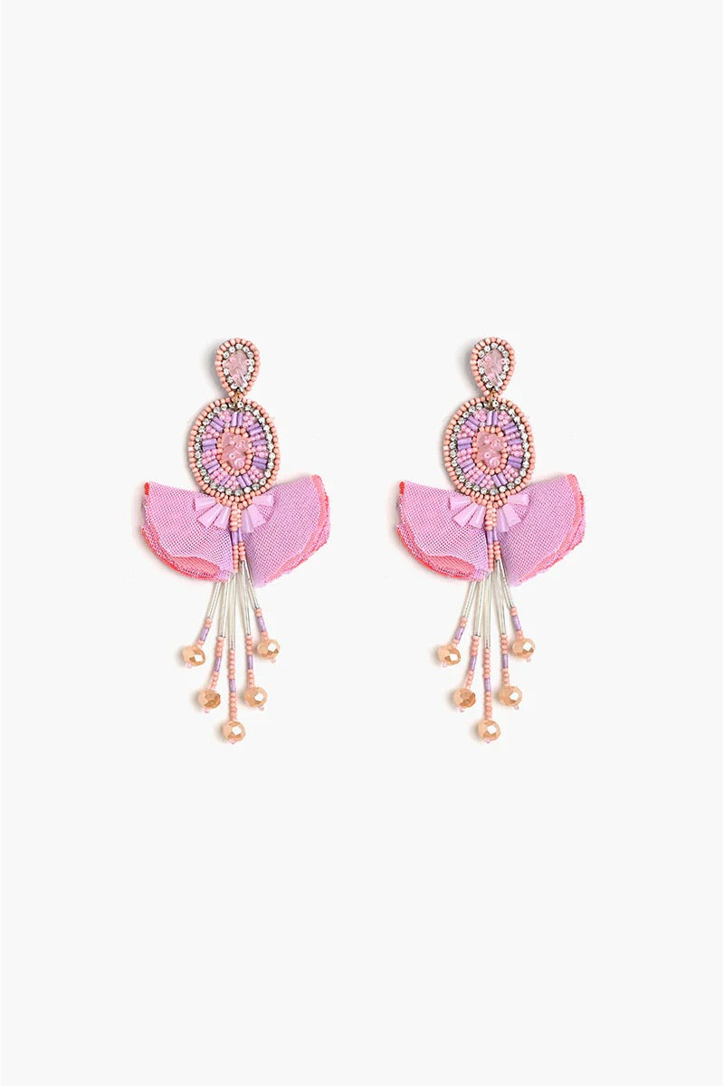 Elevate your style with our Pink Blossom Beaded Earrings, a unique blend of elegance and charm. These exquisite, handcrafted earrings feature an oval shape design adorned with delicate fabric petal flower details, adding a touch of floral grace to your ensemble. Cascading from the oval base are four beaded fringes that gently sway, catching the light and drawing attention to your every step.