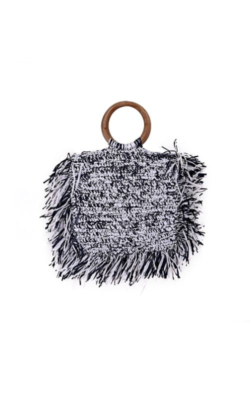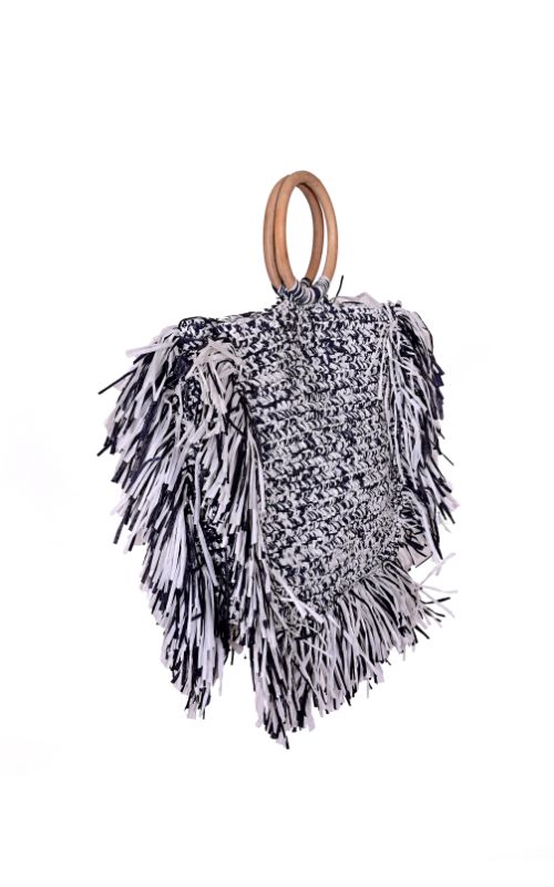 Hand-held Tote, wooden handle, hand woven with raffia palm fibers, magnetic button closure, hanging zip pocket