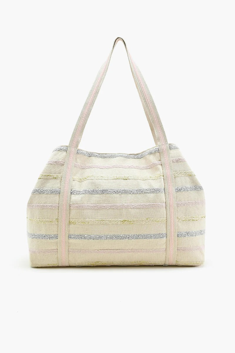 Everyone is in love with our Rose Gold Tote. An immediate best seller, this stunning tote is hand embellished with thousands of beads in shades of pink, gold, silver, and sand. Understated beauty has never quite looked this good. Micro Pom-pom line the amazing bead work which then gives way to handwoven jacquard. Light weight but roomy, this bag can take you from lunch with the girls to an impromptu overnight trip. Whether you're headed out the door or jumping on a plane, this will be the bag you grab for years to come.