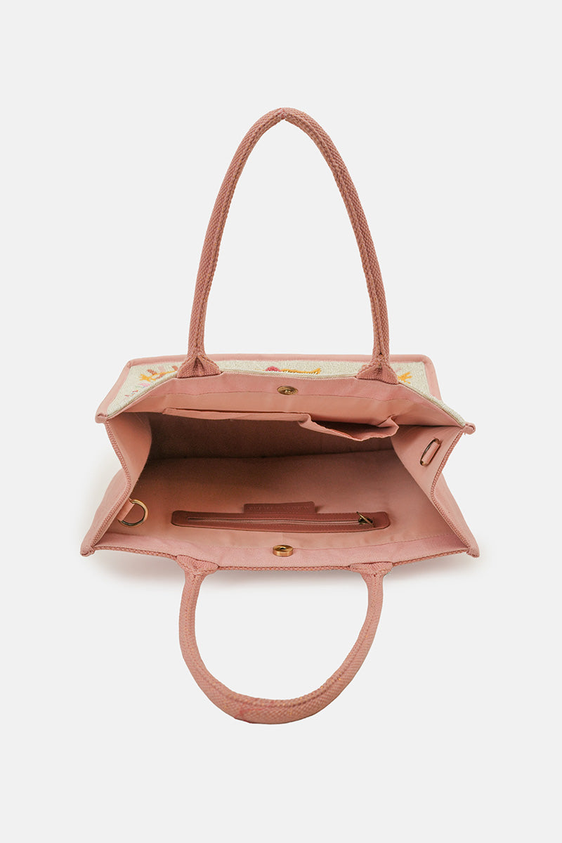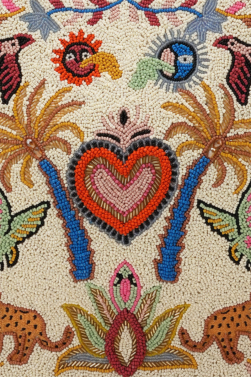 Make a statement with this structured box tote, featuring a vibrant maximalist tapestry on the front with palm trees, leopards, birds, and a striking sun-style heart at the center. Crafted from soft pink durrie fabric, this bag balances durability with playful, eye-catching style.