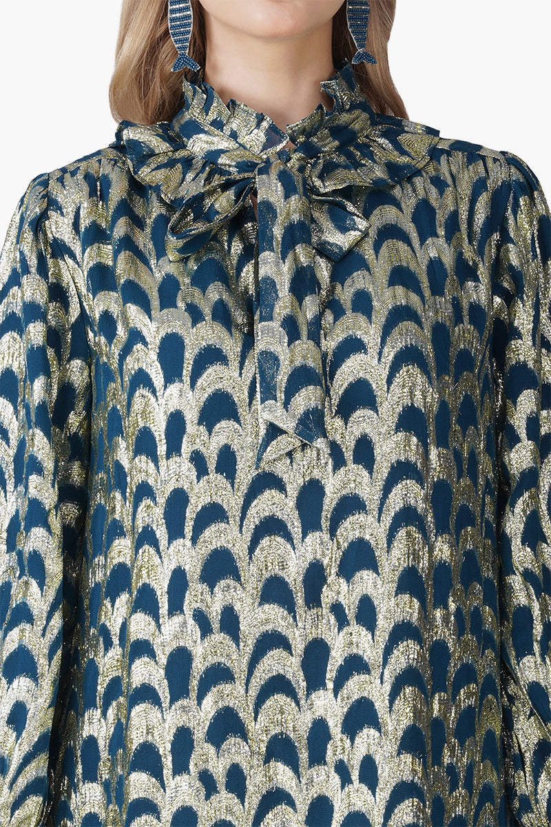 The straight silhouette with a rounded hem keeps the shape clean, while the ruffled neckline and tie-knot string add a feminine touch. Full sleeves finish with broad cuffs and two-button closures, bringing structure to the airy design.