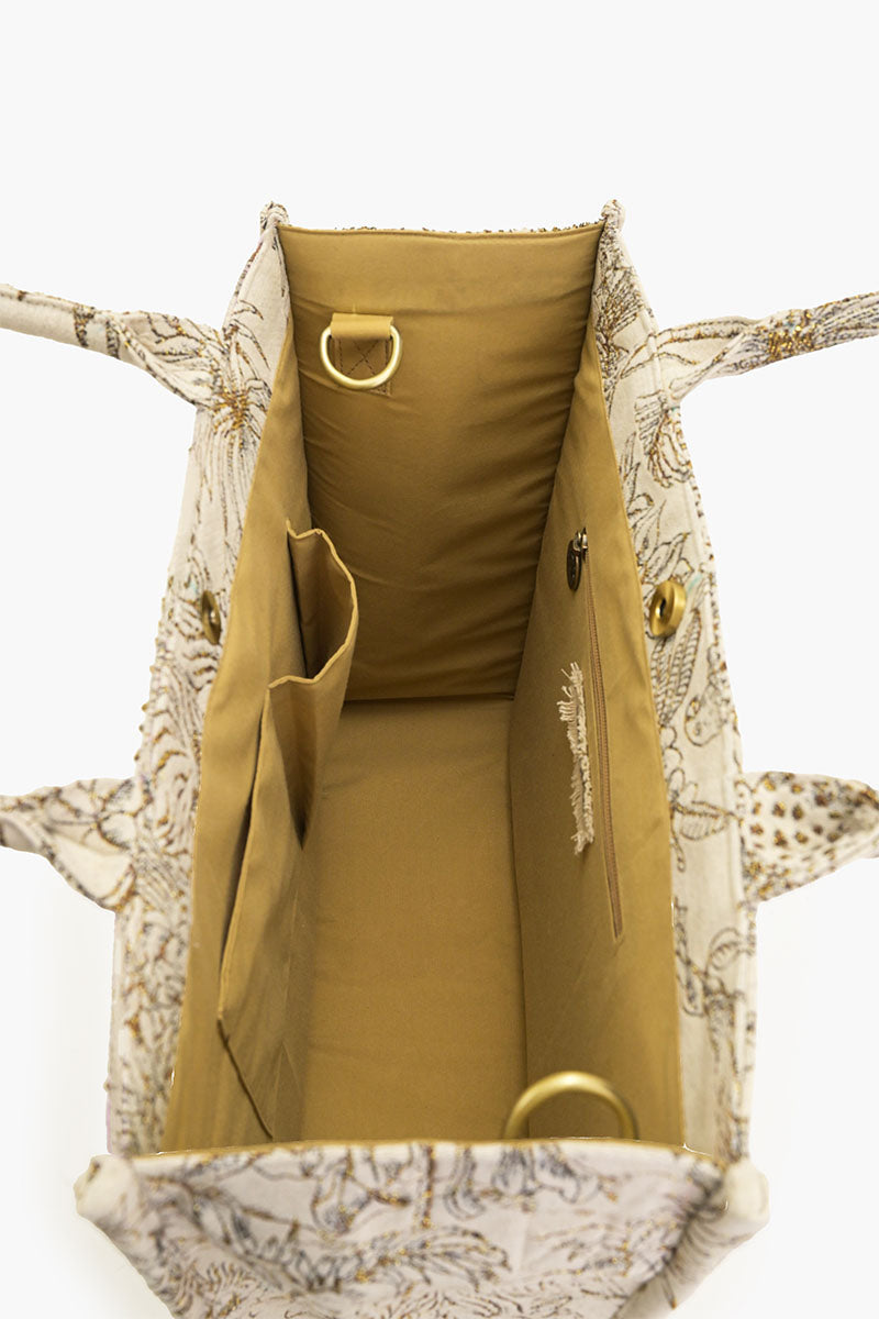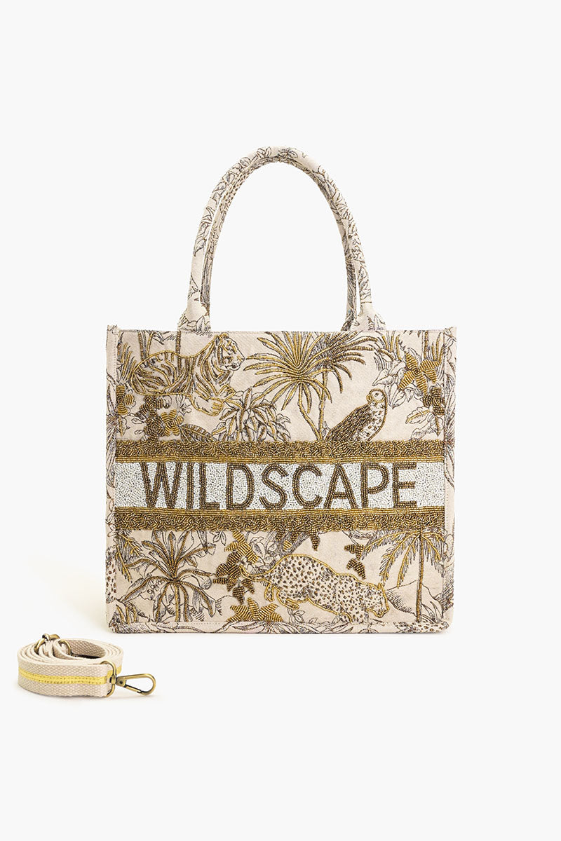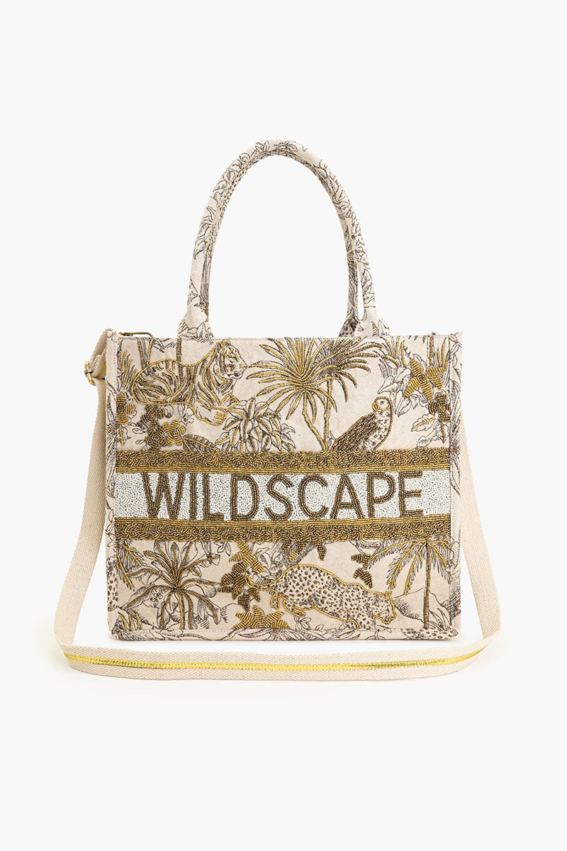 This boxy tote bag is ready to bring the wild vibes to your style, featuring stunning wildscape beading on the front that’s as bold as it is beautiful. Made with durable cotton and golden lurex wild woven jacquard, it combines strength with a touch of sparkle.